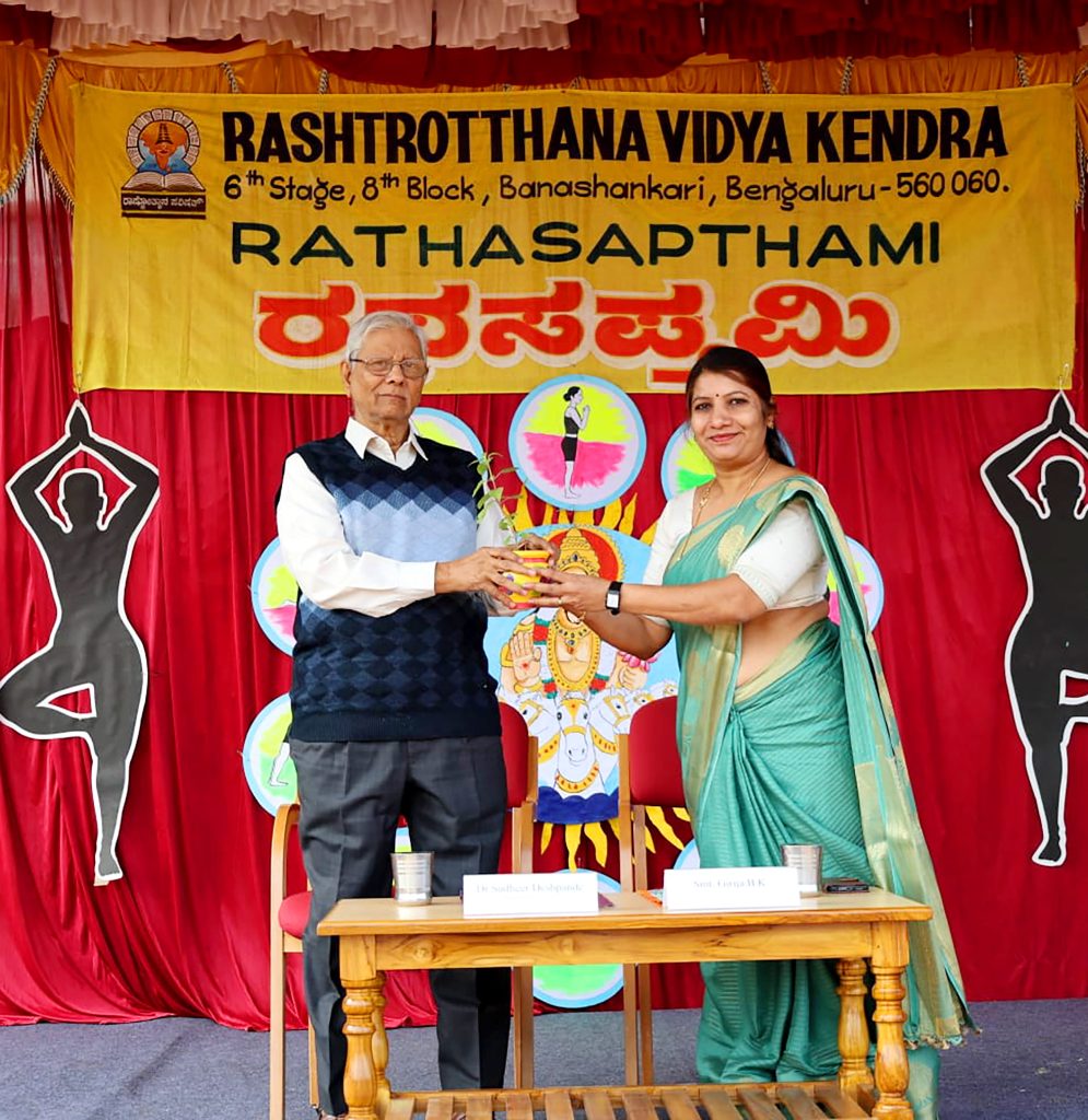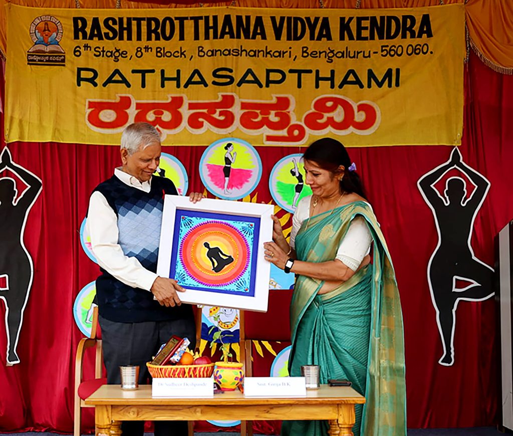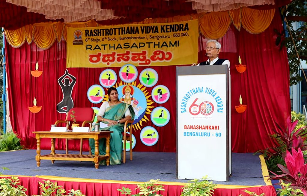 ಬೆಂಗಳೂರು, ಜ. 24: ರಾಷ್ಟ್ರೋತ್ಥಾನ ವಿದ್ಯಾಕೇಂದ್ರ – ಬನಶಂಕರಿಯಲ್ಲಿ ರಥಸಪ್ತಮಿ ಮತ್ತು ರಾಷ್ಟ್ರೀಯ ಮತದಾರರ ದಿನವನ್ನು ಆಚರಿಸಲಾಯಿತು. ಕಾರ್ಯಕ್ರಮಕ್ಕೆ ಮುಖ್ಯ ಅತಿಥಿಗಳಾಗಿ ಸುಪ್ರಸಿದ್ದ ಯೋಗ ಸಂಶೋಧಕರಾದ, ಅನುಭವಿ ಯೋಗ ಶಿಕ್ಷಕರಾದ ಶ್ರೀ ಡಾ. ಸುಧೀರ್ ದೇಶಪಾಂಡೆಯವರು ಆಗಮಿಸಿದ್ದರು. ವಿದ್ಯಾರ್ಥಿಗಳು ರಥಸಪ್ತಮಿಯ ಮಹತ್ವವನ್ನು ಮತ್ತು ಈ ದಿನ ಆಚರಿಸಲಾದ ರಾಷ್ಟ್ರೀಯ ಮತದಾರರ ದಿನ ದ ಮಹತ್ವವನ್ನು ತಿಳಿಸಿದರು. ರಾಷ್ಟ್ರೀಯ ಮತದಾರರ ದಿನದ ಅಂಗವಾಗಿ ಪ್ರತಿಜ್ಞಾ ಸ್ವೀಕಾರವನ್ನು ಮಾಡಲಾಯಿತು. ಯೋಗ ಪರಿಣಿತ ವಿದ್ಯಾರ್ಥಿಗಳು ಯೋಗಭಂಗಿಯನ್ನು ಪ್ರದರ್ಶಿಸಿದರು. ತದನಂತರ ಯೋಗ ಶಿಕ್ಷಕಿ ಶ್ರೀಮತಿ ಪ್ರೇಮಲತಾ ಅವರು ಯೋಗ ವರದಿಯನ್ನು ವಾಚಿಸುತ್ತಾ “ಪ್ರತಿ ವರ್ಷವೂ ರಥಸಪ್ತಮಿಯ ಒಂದು ವಾರ ಮುಂಚಿತವಾಗಿ ಸೂರ್ಯನಮಸ್ಕಾರ ಯಜ್ಞವನ್ನು ಹಮ್ಮಿಕೊಳ್ಳಲಾಗುತ್ತದೆ. ಅದರಂತೆ ವಿದ್ಯಾರ್ಥಿಗಳು ಹಾಗೂ ಪೋಷಕರು ನಿತ್ಯ ಮನೆಯಲ್ಲಿ ಮಾಡಿದ ಸೂರ್ಯನಮಸ್ಕಾರಗಳ ಒಟ್ಟು ಸಂಖ್ಯೆ 3,53,092 ಆಗಿರುವುದಾಗಿಯೂ ಮತ್ತು ಸುತ್ತಮುತ್ತಲಿನ ಸರಕಾರಿ ಶಾಲೆಗಳಲ್ಲಿ ಯೋಗಶಿಕ್ಷಣ ನೀಡುತ್ತಿರುವ ಹಿಂದಿನ ಉದ್ದೇಶ ಸ್ವಸ್ಥ-ಸುಸ್ಥಿರ ಸಮಾಜ ನಿರ್ಮಾಣ” ಎಂಬುದನ್ನು ತಿಳಿಸಿಕೊಟ್ಟರು. ಕಾರ್ಯಕ್ರಮವನ್ನುದ್ದೇಶಿಸಿ ಮುಖ್ಯ ಅತಿಥಿಗಳಾದ ಶ್ರೀಯುತ ಡಾ. ಸುಧೀರ್ ದೇಶಪಾಂಡೆಯವರು ಮಾತನಾಡುತ್ತಾ;“ಯೋಗ ಎಂಬುದು ನಮ್ಮ ದೇಹ ಹಾಗೂ ಮನಸ್ಸುಗಳನ್ನು ಸಮದೂಗಿಸುವ ಸಾಧನವಾಗಿದೆ. ನಾವು ನಿತ್ಯ ಮಾಡುವ ಕಾರ್ಯಗಳು ದೇಹ ಮತ್ತು ಮನಸ್ಸುಗಳನ್ನು ಅವಲಂಬಿಸಿರುತ್ತದೆ. ಸೂರ್ಯ ಸಕಲ ಜೀವ ಚರಾಚರಗಳ ಮೂಲ ಶಕ್ತಿಕೇಂದ್ರವಾಗಿದ್ದಾನೆ. ಸೂರ್ಯನಿಂದ ಬರುವ ವಿಟಮಿನ್-ಡಿ ಜೀವಸತ್ವ ಎಲ್ಲ ಜೀವಿಗಳಿಗೂ ಅತೀ ಅವಶ್ಯಕವಾಗಿದ್ದು ಈ ಎಲ್ಲಾ ವೈಜ್ಞಾನಿಕ ಹಿನ್ನೆಲೆಯನ್ನಿಟ್ಟುಕೊಂಡು ನಾವು ಪ್ರತಿ ವರ್ಷ ರಥಸಪ್ತಮಿಯನ್ನು ಆಚರಿಸುತ್ತೇವೆ. ನಿತ್ಯ ಅಭ್ಯಾಸದಿಂದ ಸೂರ್ಯನ ಶಿಸ್ತನ್ನುನಮ್ಮ ಜೀವನದಲ್ಲಿ ಅಳವಡಿಸಿಕೊಳ್ಳಬೇಕಾಗಿದೆ. ಆತನಿಗೆ ಒಂದು ನಮಸ್ಕಾರವನ್ನಷ್ಟೆ ನಾವು ಕೊಡಲು ಸಾಧ್ಯ” ಎಂದು ನುಡಿದರು.ನಂತರ ಶಿಕ್ಷಕರು ಹಾಗೂ ಸುಮಾರು 2,500 ವಿದ್ಯಾರ್ಥಿಗಳು ಸಾಮೂಹಿಕ ಸೂರ್ಯನಮಸ್ಕಾರವನ್ನು ಮಾಡಿದರು. ಯೋಗ ಶಿಕ್ಷಕರ ನೇತೃತ್ವದಲ್ಲಿ 108 ಸೂರ್ಯನಮಸ್ಕಾರದ ನಂತರ ಶವಾಸನ/ಯೋಗನಿದ್ರೆಯ ಮೂಲಕ ಕಾರ್ಯಕ್ರಮ ಸಮಾಪ್ತಿಯಾಯಿತು.