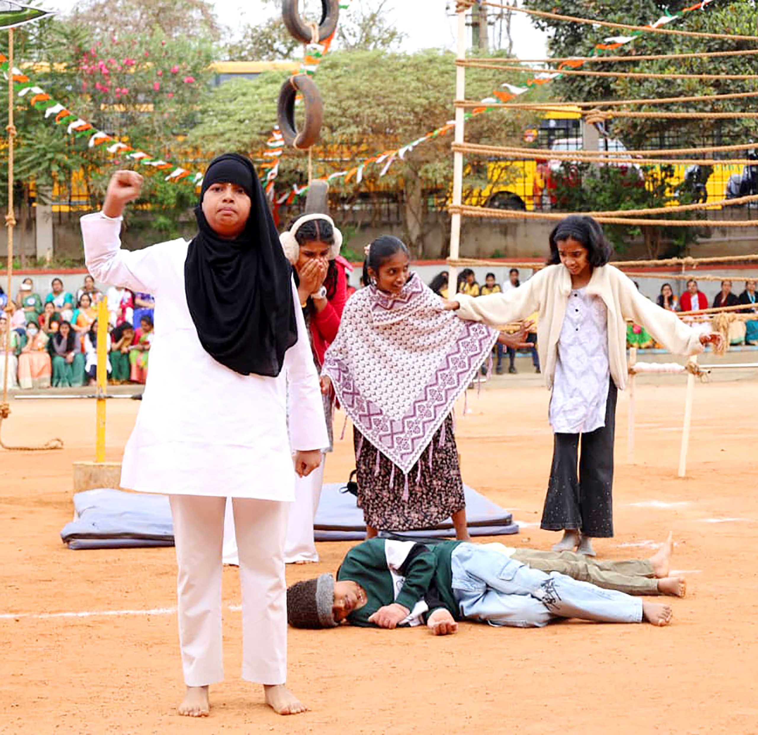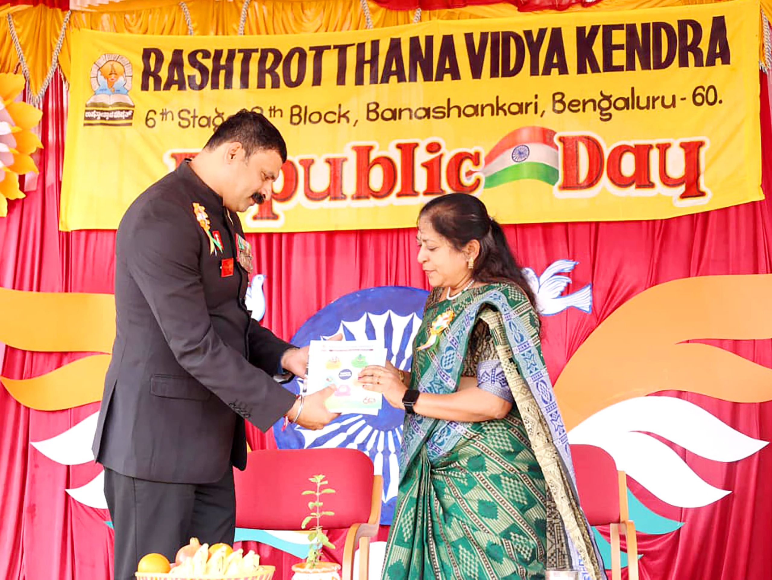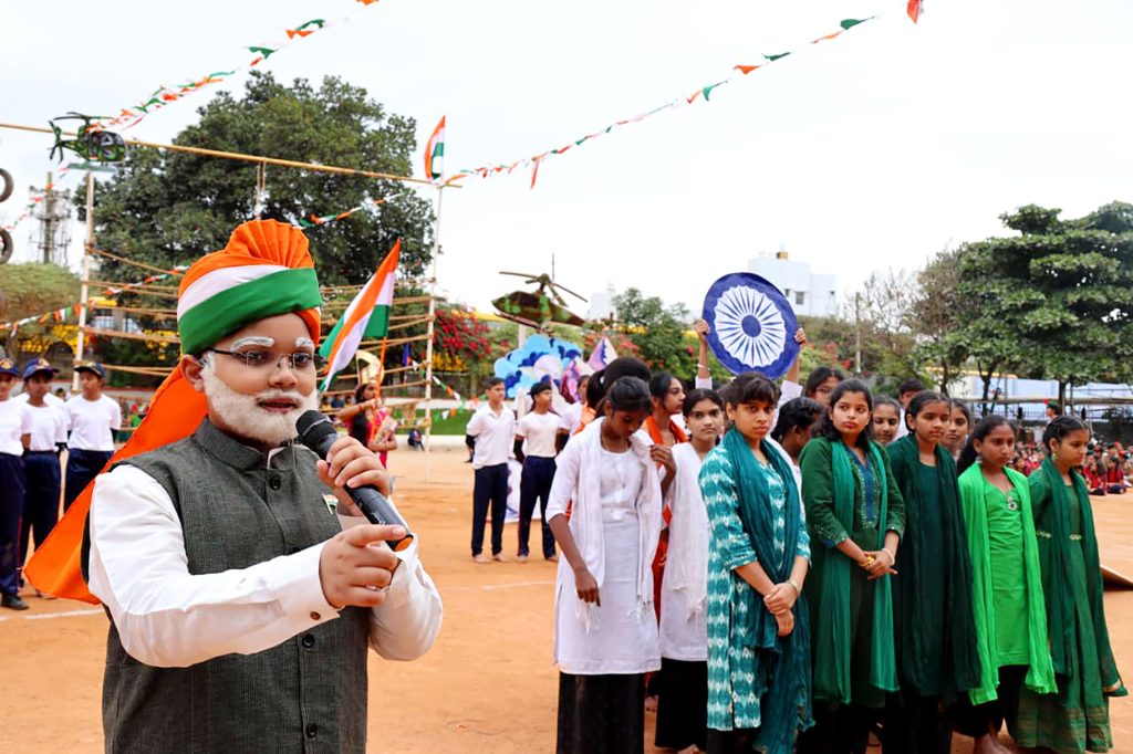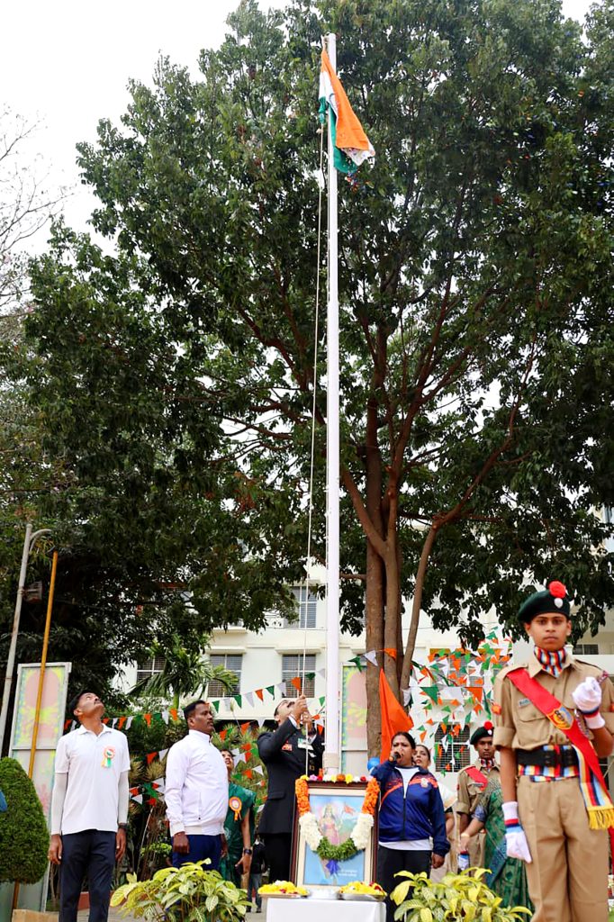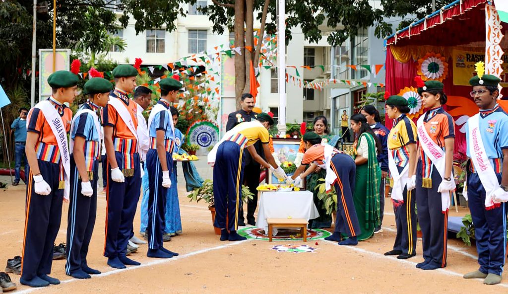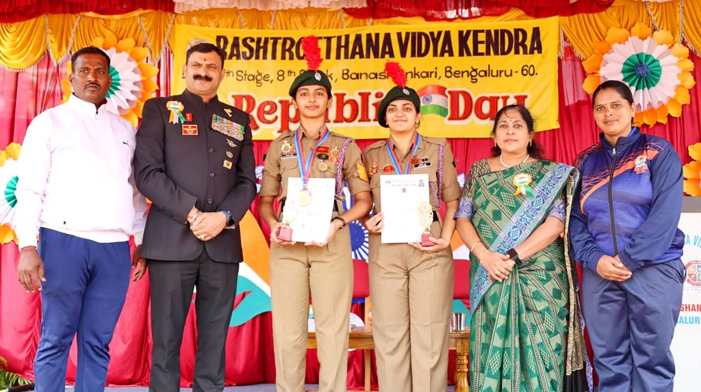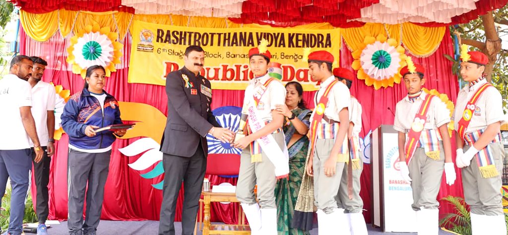Bengaluru, Jan. 26: The 77th Republic Day was celebrated herein Rashtrotthana Vidya Kendra – Banashankari. Sri Yogish Poovaiah, a former Havildar and Commando Instructor in the Indian Army, was the chief guest for the program. The dignitaries were warmly welcomed with a guest salute led by the Ghosh team. Then the chief guest hoisted the flag. As part of the program, a parade, various cultural programs, a karate show and various stunts by the students were displayed. On this occasion, prizes and awards were presented to students who achieved at the national level in various sports disciplines. In his speech, the chief guest Sri Yogish Poovaiah said that it is a matter of happiness that the institution is preparing students needed by the nation. He also shared with the students the exciting and inspiring experiences of his career in the army, emphasizing the importance of discipline, patriotism, and loyalty, saying that we should be capable enough to protect our own lives.