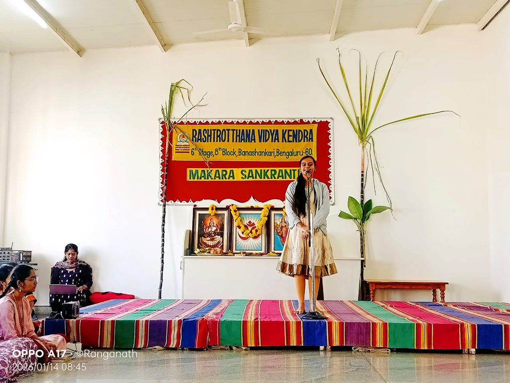 ಬೆಂಗಳೂರು, ಜ. 14: ರಾಷ್ಟ್ರೋತ್ಥಾನ ವಿದ್ಯಾಕೇಂದ್ರ – ಬನಶಂಕರಿಯಲ್ಲಿ ಸಂಕ್ರಾಂತಿ ಹಬ್ಬವನ್ನು ಆಚರಿಸಲಾಯಿತು. ಪ್ರಾರ್ಥನಾ ಮಂದಿರವನ್ನು ಎಳ್ಳು, ಬೆಲ್ಲ, ಸಕ್ಕರೆ ಅಚ್ಚು ಹಾಗೂ ಕಬ್ಬುಗಳಿಂದ ಅಲಂಕರಿಸಲಾಗಿತ್ತು.ವಿದ್ಯಾರ್ಥಿಗಳು ಸಾಂಪ್ರದಾಯಿಕ ಉಡುಗೆಯನ್ನು ಧರಿಸಿ ಹಬ್ಬದ ವಾತಾವರಣಕ್ಕೆ ಮೆರಗು ನೀಡಿದರು. ವಿದ್ಯಾರ್ಥಿಗಳು ಸಂಕ್ರಾಂತಿ ಹಬ್ಬದ ಹಿನ್ನೆಲೆ, ಮಹತ್ವ ಮತ್ತು ಆಚರಣೆಯ ವಿಧಾನಗಳನ್ನು ವಿವರಿಸಿದರು.ಸಂಕ್ರಾಂತಿ ಹಬ್ಬದ ಕುರಿತಾದ ನೃತ್ಯ ಪ್ರದರ್ಶನವನ್ನು ವಿದ್ಯಾರ್ಥಿಗಳು ನೀಡಿದರು. ನಂತರ ಎಳ್ಳುಬೆಲ್ಲವನ್ನು ಹಂಚಲಾಯಿತು.