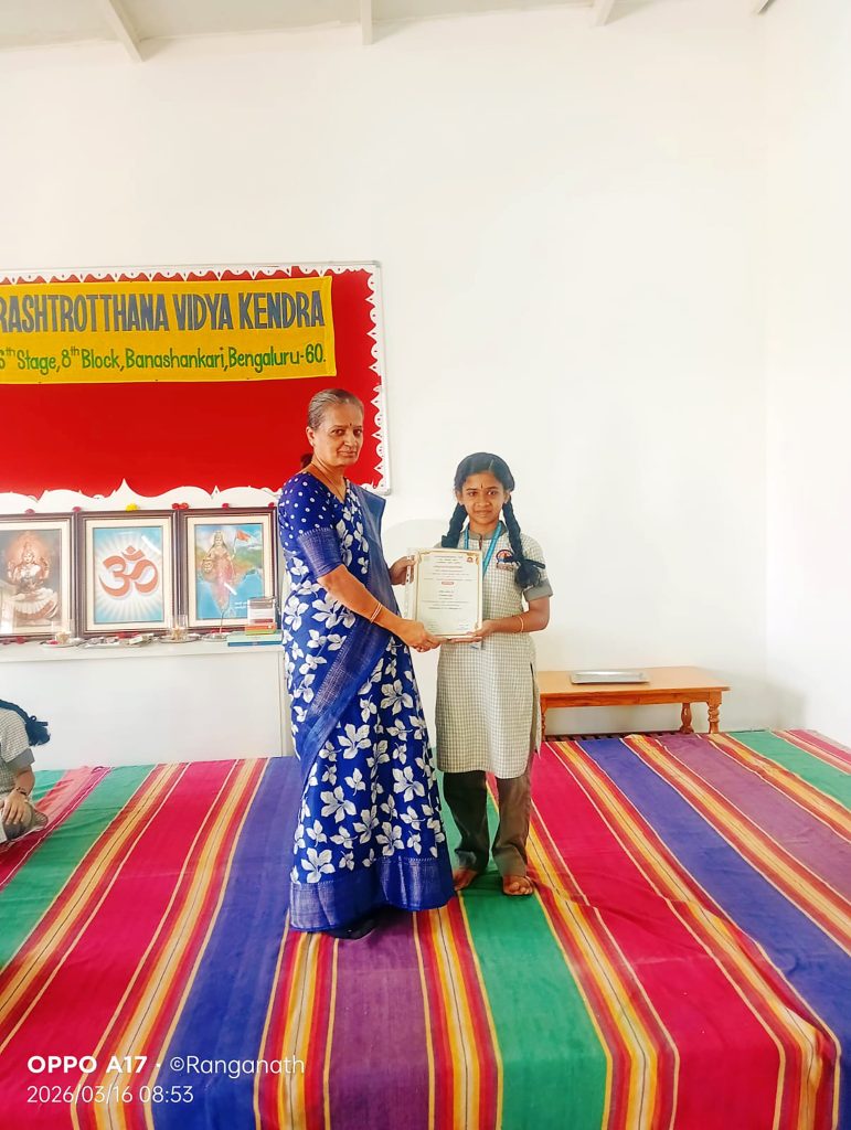 Bengaluru, Mar. 10-13: Anisha, a student of Class 7 of Rashtrotthana Vidya Kendra – Banashankari, participated in the Akhil Bharatiya Shastrotsava organised by the Central Sanskrit University in Kanchipuram from March 10 – 13. In the Bhagavad Gita memorisation category, Anisha achieved a remarkable feat by becoming one of the six participants selected for the prestigious “Vishishta Puraskar (First Class)” out of 24 competitors from across India. The award includes a certificate of excellence and a cash prize of ₹12,000. Additionally, the Karnataka team secured the highest number of prizes and won the “Vijaya Vaijayanti Award,” claiming the golden idol of Goddess Saraswati.