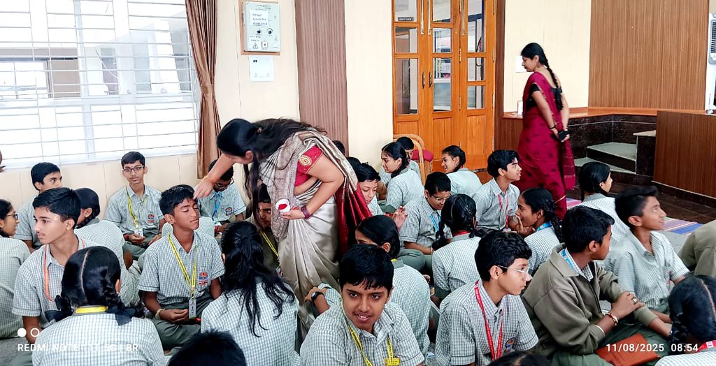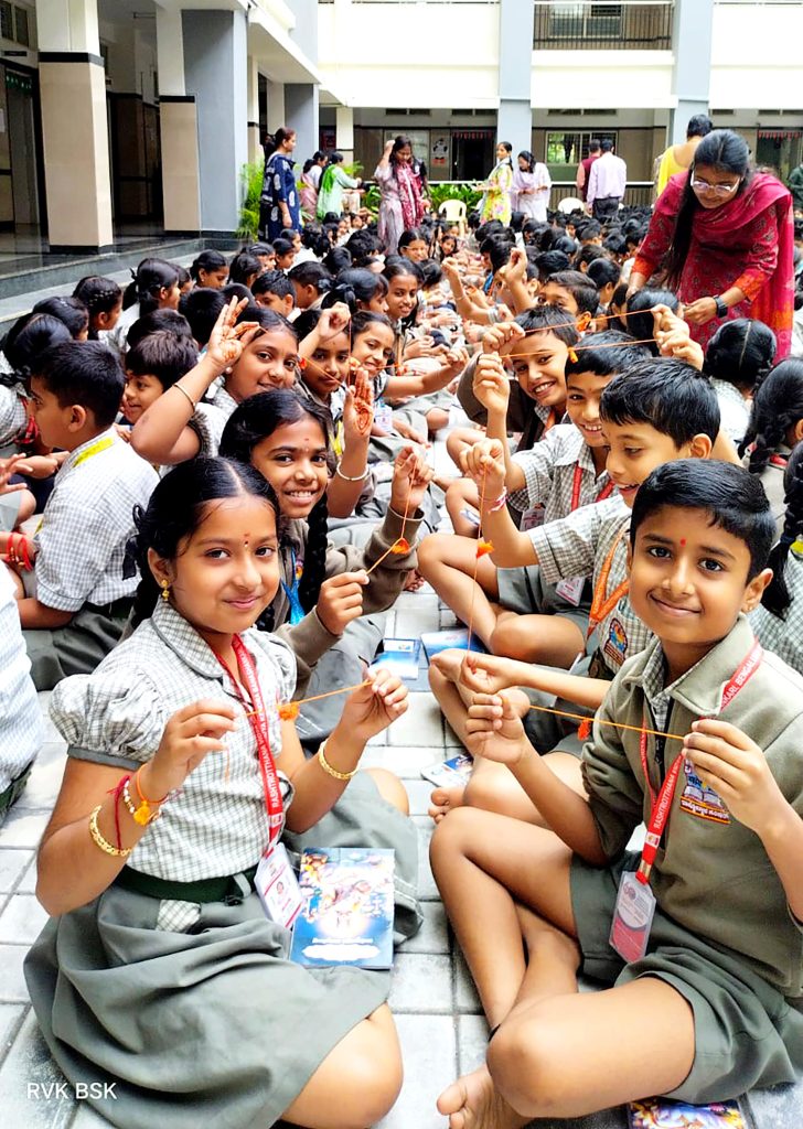 Bengaluru, Aug. 11: Raksha Bandhan, a symbol of brotherhood and harmony, was celebrated herein Rashtrotthana Vidya Kendra – Banashankari. Explaining the importance of Raksha Bandhan, the students told everyone that this festival is not only about the bond between brothers and sisters, but also a cultural festival that strengthens all human relationships in society. They mentioned many mythological stories behind the festival and impressed everyone with its spiritual and social aspects. Later, the students presented a melodious song that spread the message of Raksha Bandhan. After that, the teachers tied Rakhi with tilak to all the teaching and non-teaching male staff of the school. The students also tied Rakhi to their classmates, and all the teachers tied Rakhi to each other. The students of class 8 visited places like government schools, hospitals, post offices in the vicinity and tied Rakhi to the people there and explained the importance of the festival.