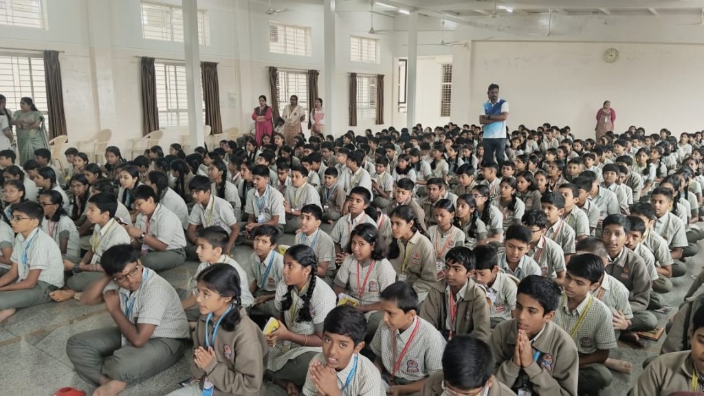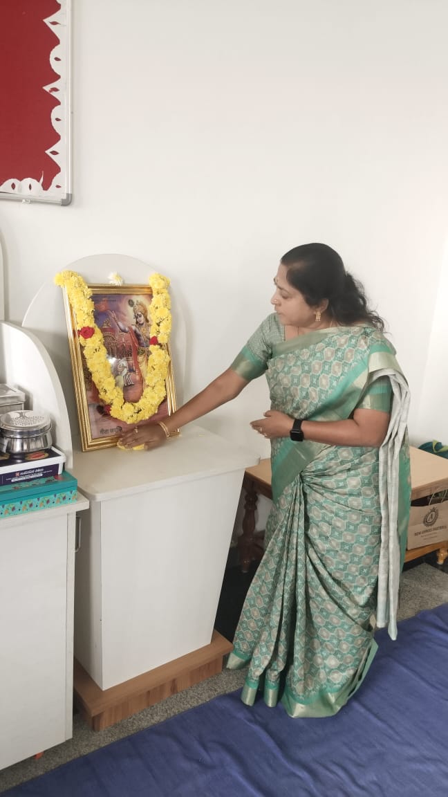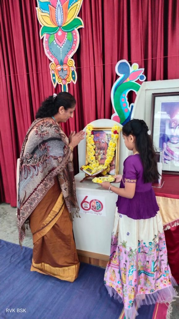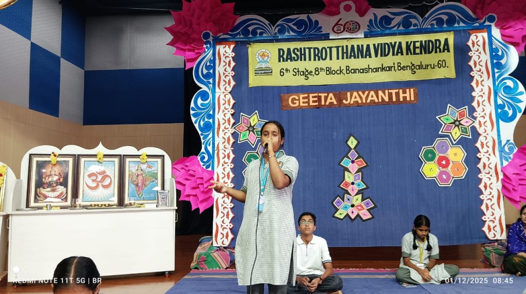 Bengaluru, Dec. 1: Gita Jayanti was celebrated herein Rashtrotthana Vidya Kendra – Banashankari.The students explained in detail the purpose and background of celebrating Gita Jayanti, saying that this day marks the birth of the Hindu holy book, Bhagavad Gita. That is, Gita Jayanti marks the day when Lord Krishna preached the Gita to Arjuna.Later, the little students dressed up as Krishna and Arjuna and acted out a scene of preaching the Gita. The students recited a selected chapter of the Bhagavad Gita en masse.