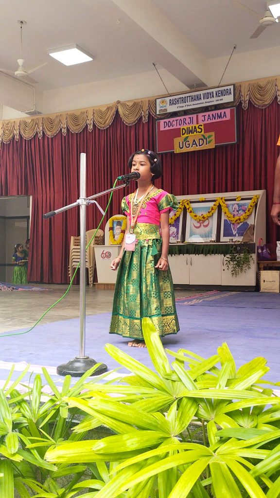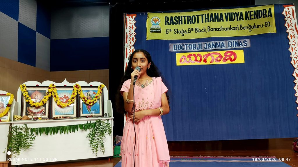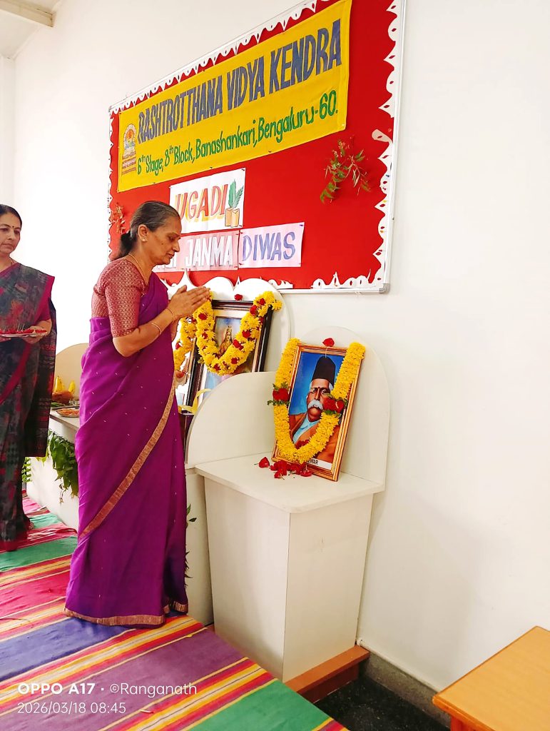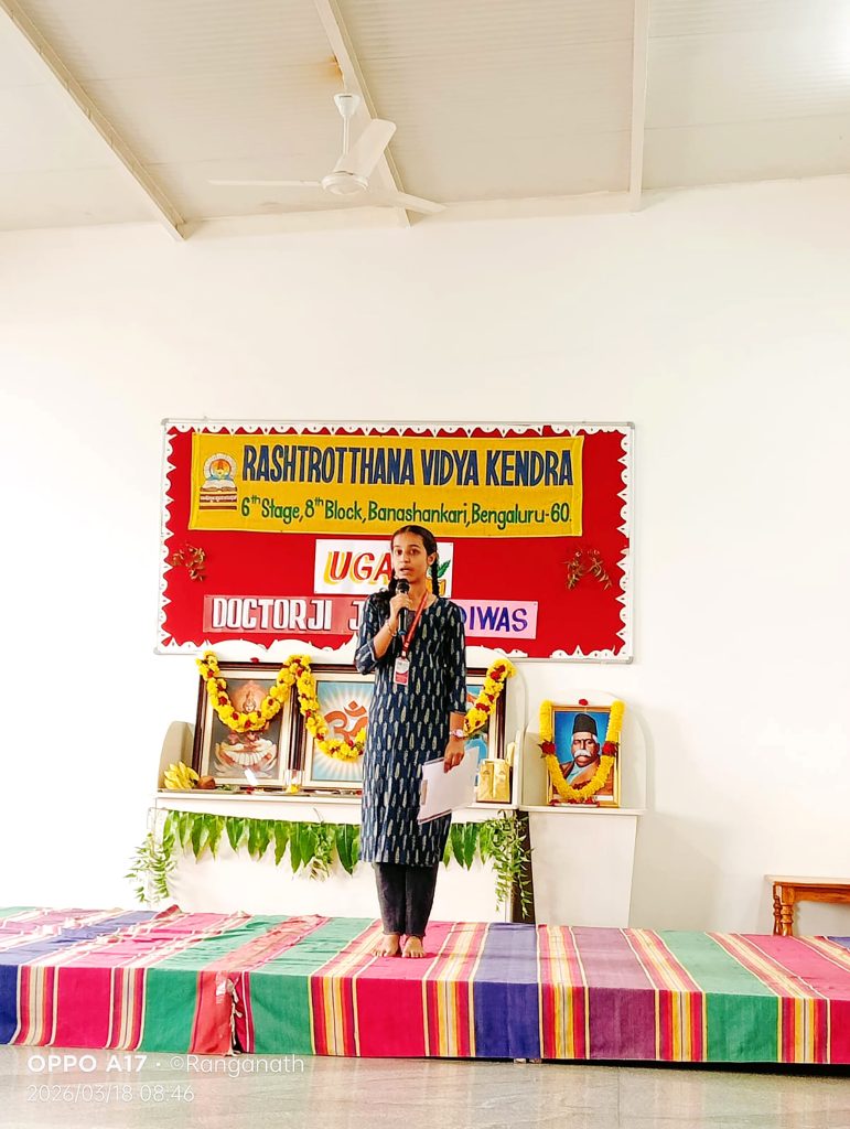 Bengaluru, Mar. 18: Yugadi festival and Dr Keshav Baliram Hedgewar’s birth anniversary were celebrated herein Rashtrotthana Vidya Kendra – Banashankari. Students explained in detail the life of Dr. Ji, his participation in the freedom struggle and the establishment of the Swayamsevak Sangh, and the way he dedicated himself to the work of the organisation. Students celebrated the Yugadi festival and celebrated Yugadi, the new year of Hindus. On this day, we should accept neem and jaggery equally and develop the self-confidence to face difficulties and joys. The entire nature is celebrating with new vitality for Yugadi. May that celebration find a home in everyone’s home and mind. The students talked about the celebration and the importance of the Yugadi festival. Students performed a beautiful dance.