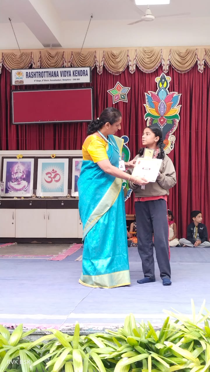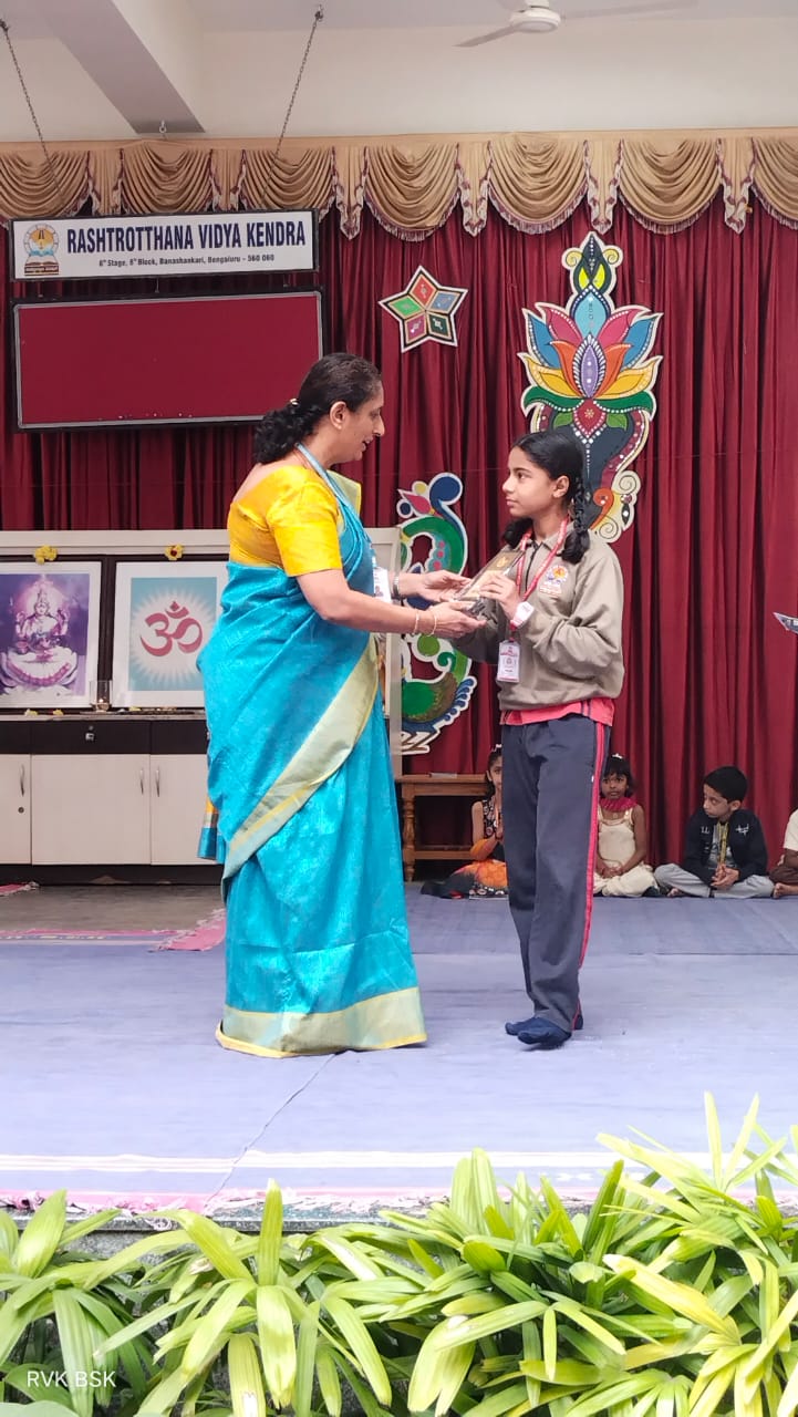 Bengaluru, D. 5: Anagha, a student of Class 6F section of Rashtrotthana Vidya Kendra – Banashankari, has secured 3rd place in the state-level speech competition on the topic “Impact of Bhagavad Gita on the Indian Freedom Struggle” organized by Swarnavalli Math.