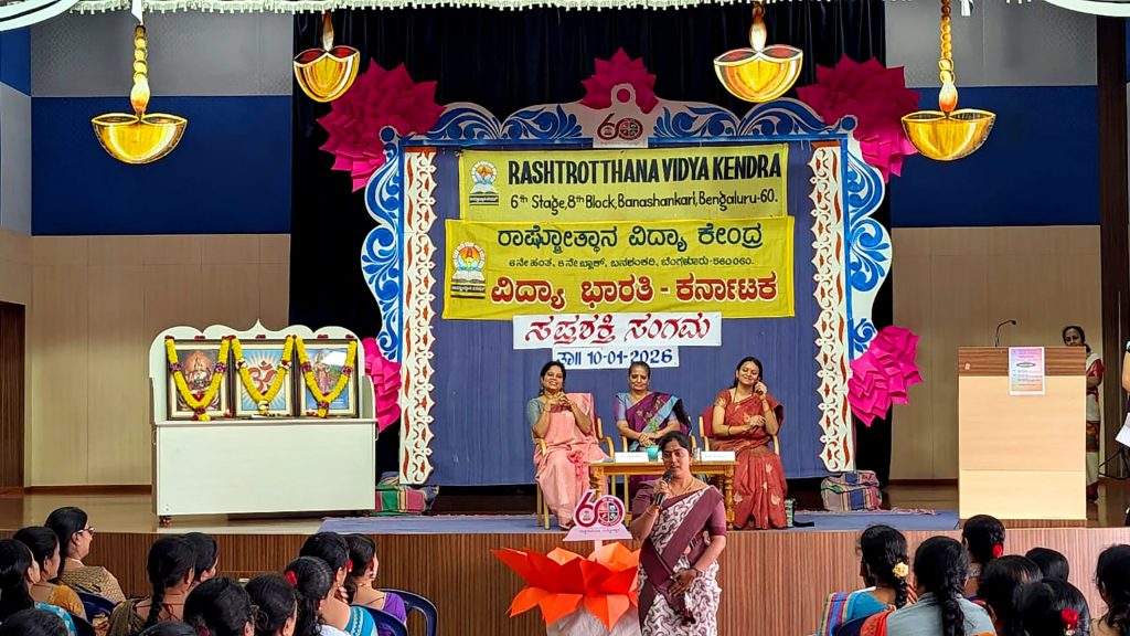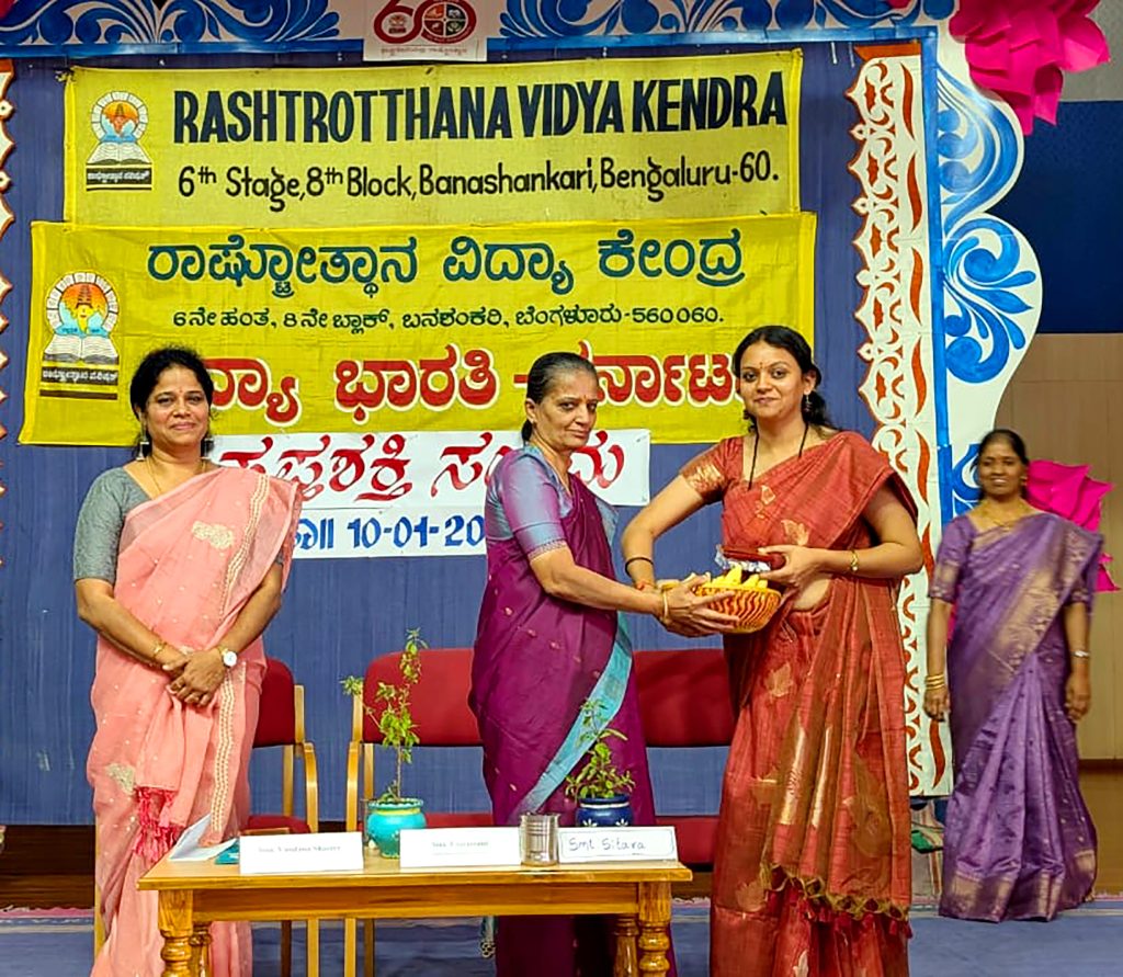 Bengaluru, Jan. 10: A special program called “Saptashakti Sangam” was organized herein Rashtrotthana Vidya Kendra – Banashankari under the guidance of Vidya Bharatiya under the guidance of the school principal, Smt. Nanda. This was a meaningful program organized by women for women.The program was presided over by RVK, and Smt. Godamani, the educational supervisor of the South Zone, spoke and emphasized the importance of mothers. The program was attended by resource persons, Smt. Vandana Shastri and Smt. Sitara, who shared their valuable ideas. In this program, which was held in two sessions, the resource persons spoke inspiringly on the power, potential, skills inherent in women and their role in building society, and the environment according to Indian philosophy. Smt. Vandana Shastri, a bold woman working for the society and one of the parents of the school, was honoured in this program. At the end of the program, the ceremony concluded with the pledge, “I will be a good woman, a good citizen, and responsibly protect my family and the environment.”