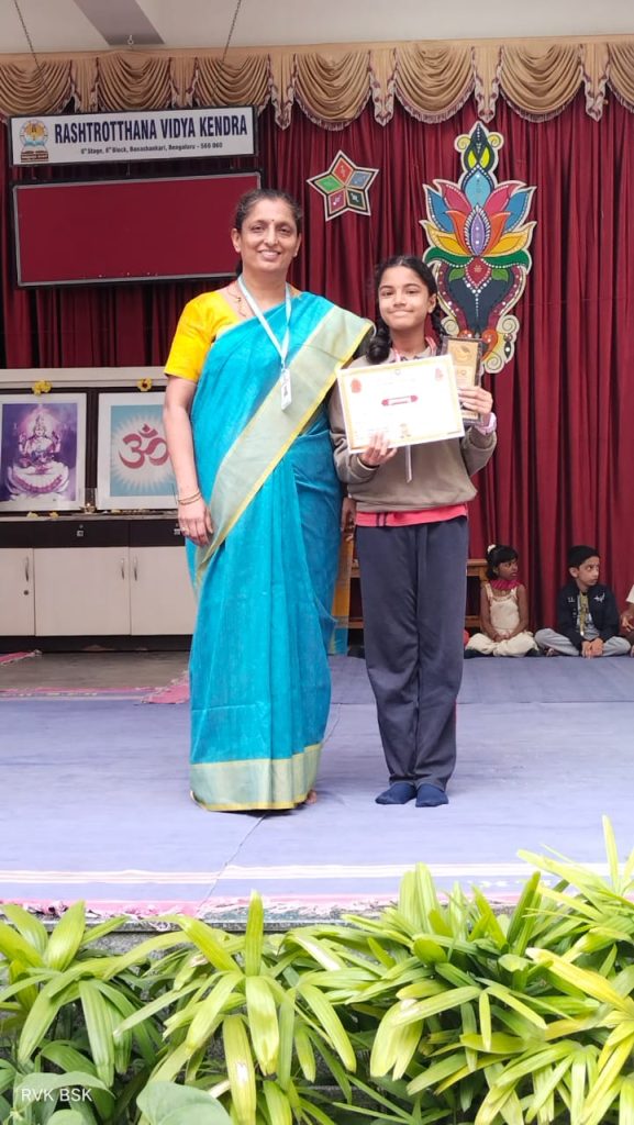 Bengaluru, D. 5: Anagha, a student of Class 6F section of Rashtrotthana Vidya Kendra – Banashankari, has secured 3rd place in the state-level speech competition on the topic “Impact of Bhagavad Gita on the Indian Freedom Struggle” organized by Swarnavalli Math.