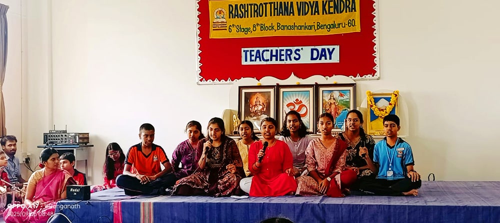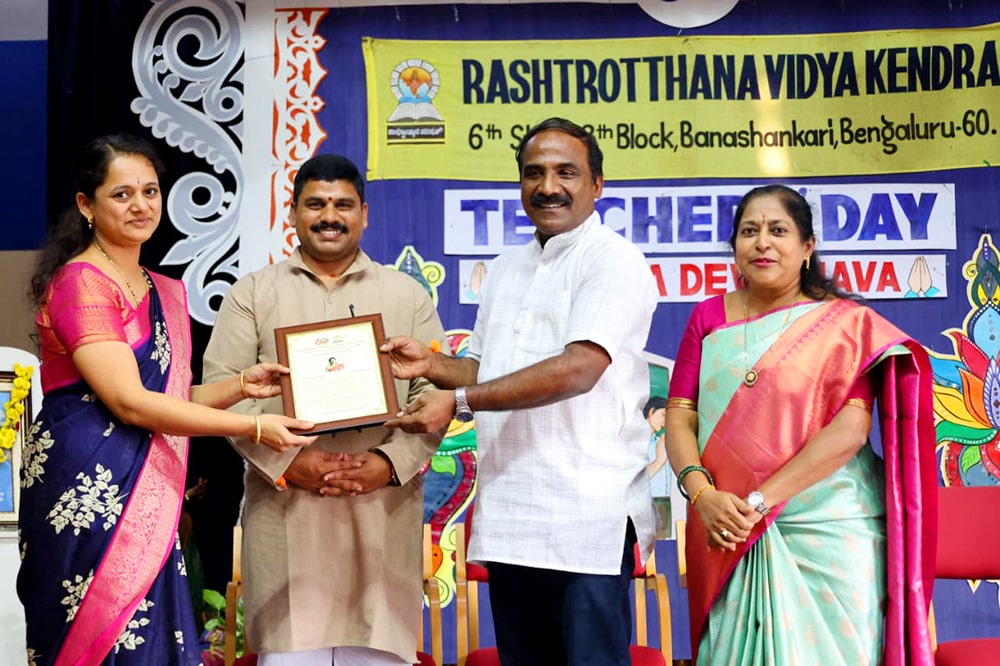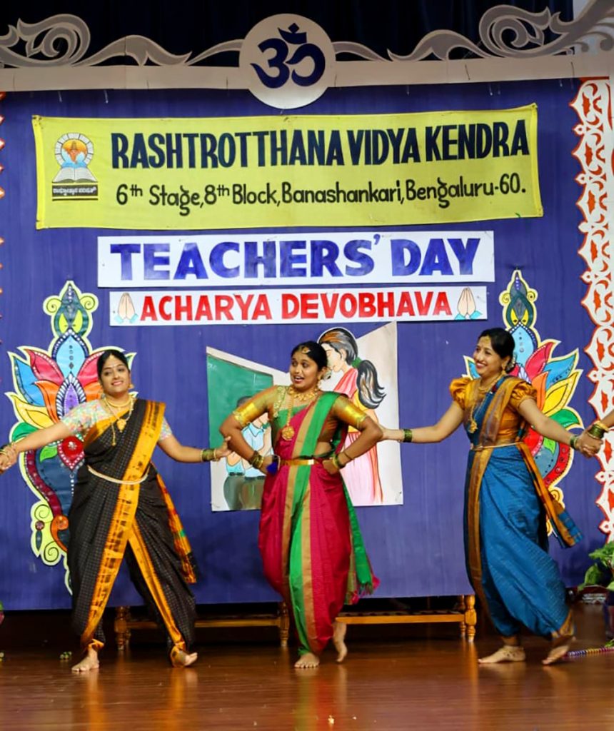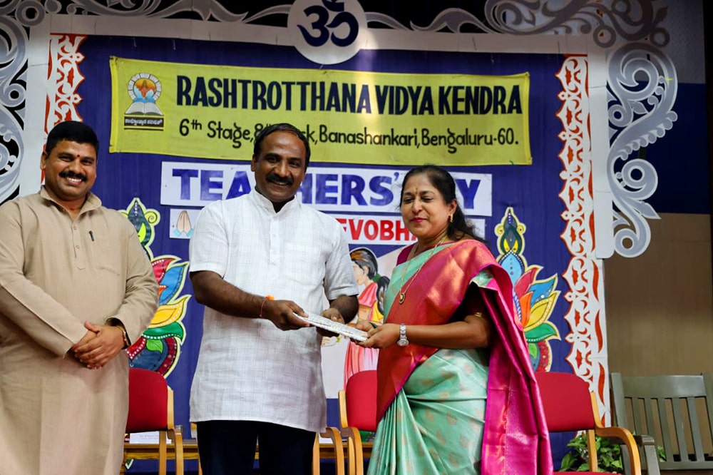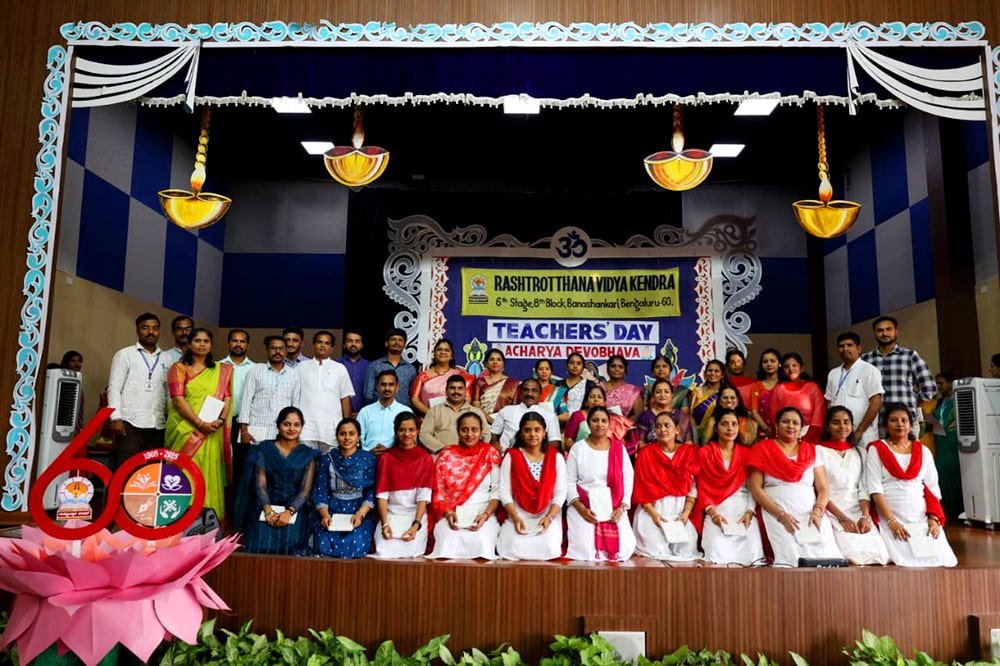Bengaluru, Sept. 5: Teachers Day program was organized herein Rashtrotthana Vidya Kendra – Banashankari. The students of class 10th conducted the program very beautifully. Considering the contribution made by Dr. Sarvepalli Radhakrishnan to the field of education, his birthday is celebrated as Teachers Day and the students talked about the importance of celebrating Teachers Day. Then the students entertained the teachers with music, dance, and dramas. Then the students of class 10th played the role of teachers and taught the younger children in their place that day. Then the program specially organized for the teachers of Banashankari and Somanahalli schools was attended by the chief guest, Sri. Dr. Karunakar Rai, a professor and social worker at Nitte Meenakshi College. Every teacher and student have their own unique personality and specialty. Stating that no technology can take away the place of a teacher in the coming days, he spoke about the importance of teachers by mentioning a couple of incidents that happened in his life. School Correspondent Sri Vasanth Kumar was present and appreciated the contribution and sacrifice of teachers in building a healthy and sustainable society. Many teachers displayed their hidden talents through cultural programs like song, dance, drama etc. Smt. Nanda administered the oath to the teachers. The chief guest honoured all the teachers by presenting them with books. Teachers who had worked in the institution for 10 years and rendered their valuable service were specially honoured. Some selected teachers shared their professional life experiences.