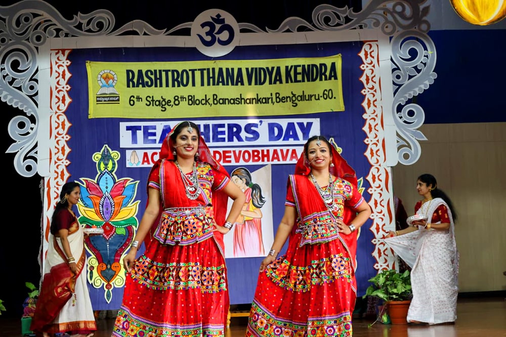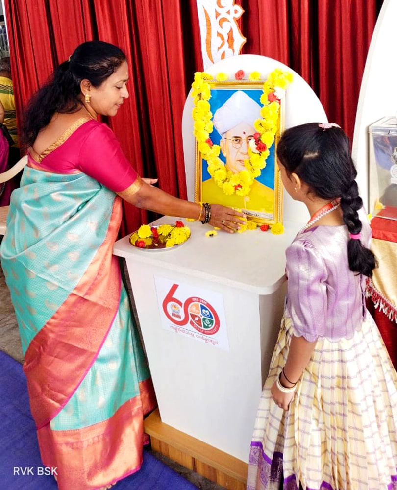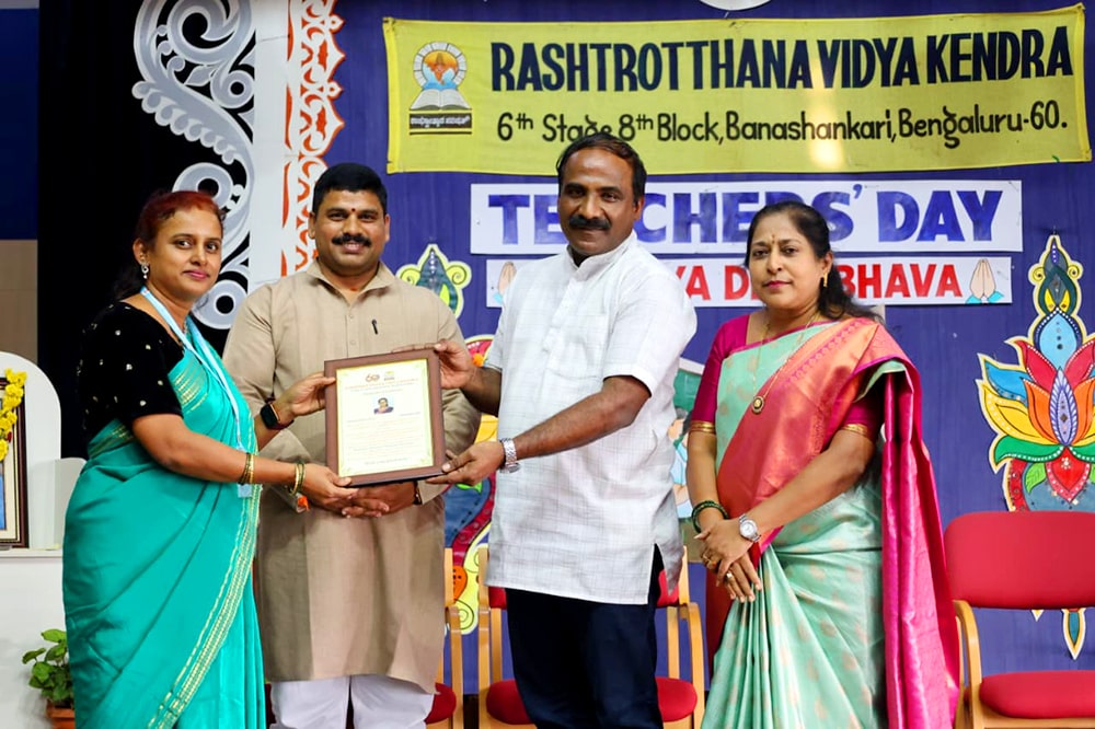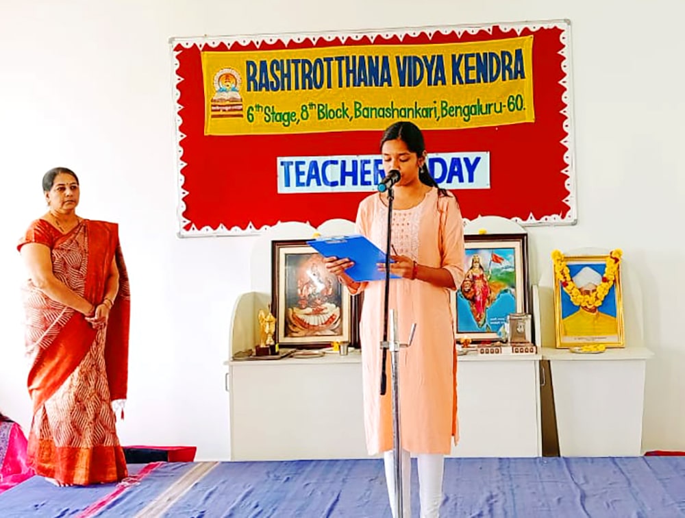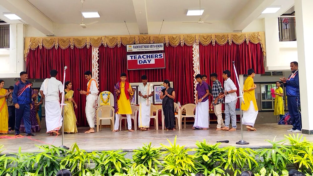 Bengaluru, Sept. 5: Teachers Day program was organized herein Rashtrotthana Vidya Kendra – Banashankari. The students of class 10th conducted the program very beautifully. Considering the contribution made by Dr. Sarvepalli Radhakrishnan to the field of education, his birthday is celebrated as Teachers Day and the students talked about the importance of celebrating Teachers Day. Then the students entertained the teachers with music, dance, and dramas. Then the students of class 10th played the role of teachers and taught the younger children in their place that day. Then the program specially organized for the teachers of Banashankari and Somanahalli schools was attended by the chief guest, Sri. Dr. Karunakar Rai, a professor and social worker at Nitte Meenakshi College. Every teacher and student have their own unique personality and specialty. Stating that no technology can take away the place of a teacher in the coming days, he spoke about the importance of teachers by mentioning a couple of incidents that happened in his life. School Correspondent Sri Vasanth Kumar was present and appreciated the contribution and sacrifice of teachers in building a healthy and sustainable society. Many teachers displayed their hidden talents through cultural programs like song, dance, drama etc. Smt. Nanda administered the oath to the teachers. The chief guest honoured all the teachers by presenting them with books. Teachers who had worked in the institution for 10 years and rendered their valuable service were specially honoured. Some selected teachers shared their professional life experiences.