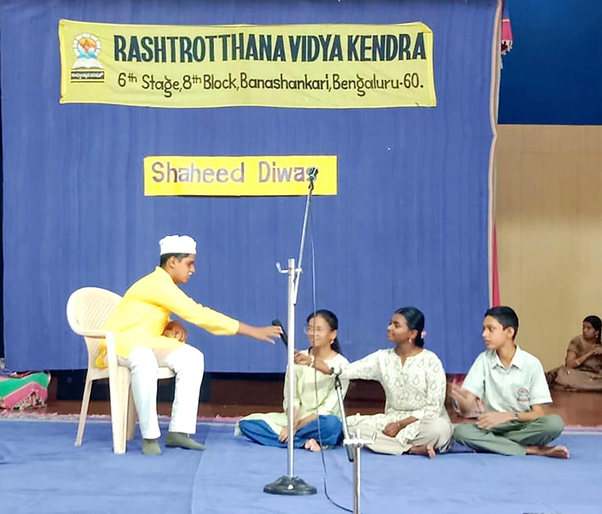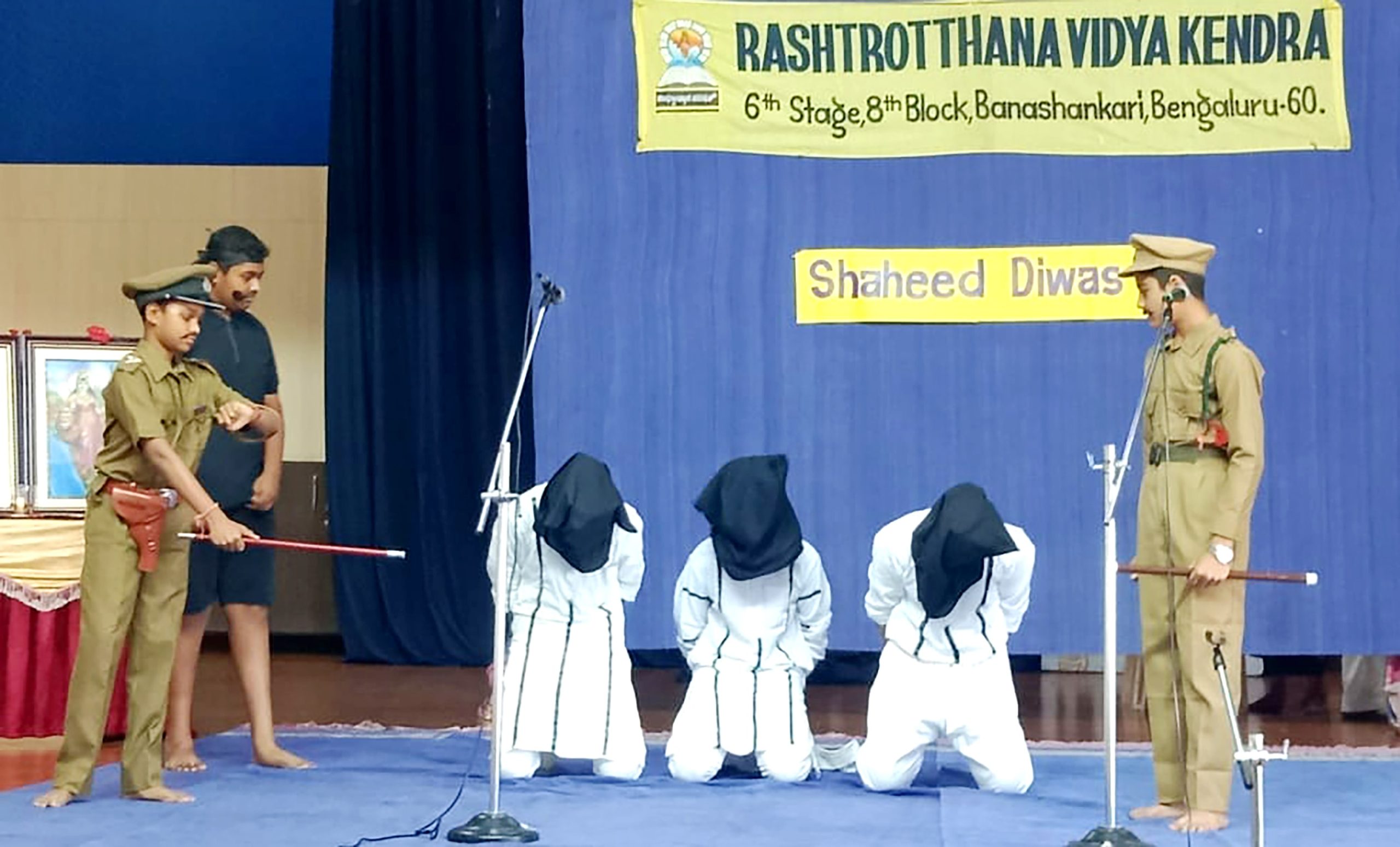 Bengaluru, Mar. 24: The “Martyrs’ Day” of the great revolutionaries Bhagat Singh, Sukhdev, and Raj Guru was celebrated herein Rashtrotthana Vidya Kendra – Banashankari.The students spoke about the lives of these three leaders and said that this Martyrs’ Day is a day to remember their contribution to the country’s freedom movement. They said that this Martyrs’ Day is celebrated to remember the unparalleled heroism of Bhagat Singh, Rajguru, and Sukhdev, to pay tribute to the unparalleled freedom fighters, and to make the people of the country remember the sacrifice and martyrdom of the revolutionary leaders who were hanged in Lahore Central Jail.The students performed a play commemorating the bravery, adventure, and sacrifice of the three heroes.
