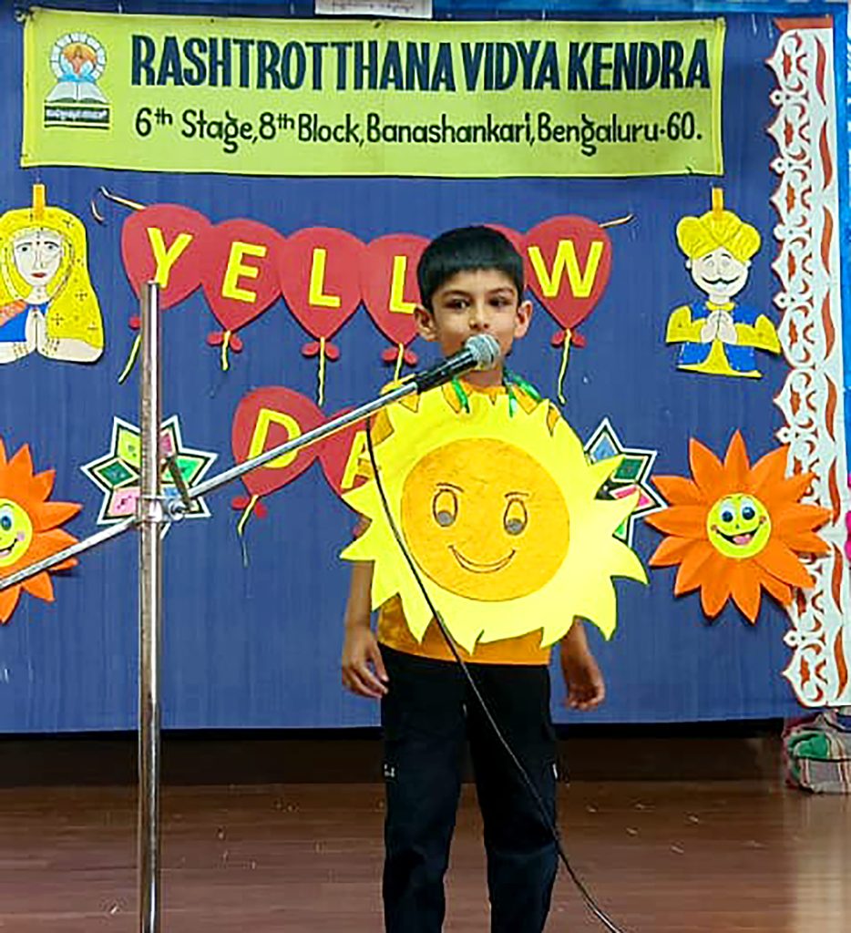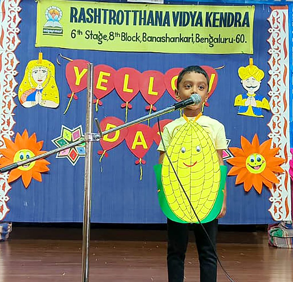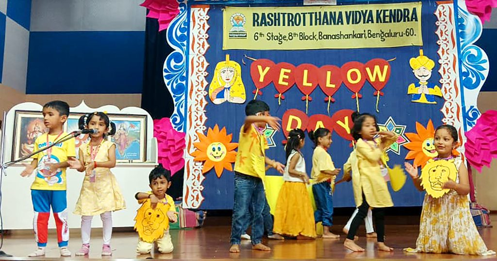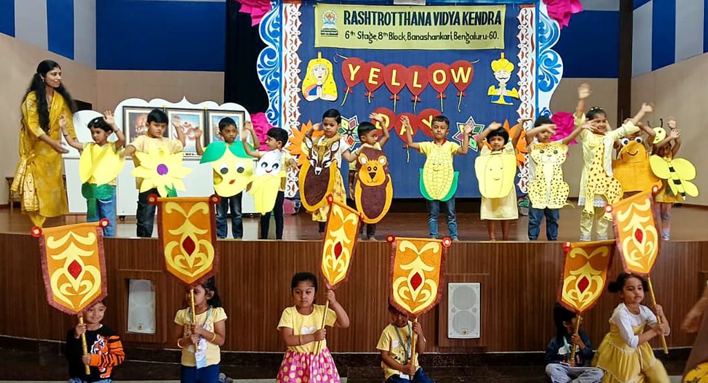 Bengaluru, Feb. 11: Yellow Day was celebrated for the children of Gokulam herein Rashtrotthana Vidya Kendra – Banashankari. The teachers decorated the school using various yellow items. Various yellow items were displayed to the children through PPT. UKG children performed a dance to the Yellow Day song. LKG children performed a yellow song through a performance. PreKG children paraded wearing hanging placards made of various yellow items. Children of all classes were given toys made of various yellow paper as gifts.